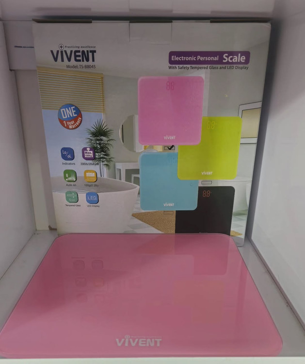 ترازوی دیجیتال Vivent با طراحی مینیمال و رنگ جذاب صورتی، ابزاری کاربردی و دکوراسیون شیک برای اتاق خواب. دقت بینظیر و نمایشگر واضح.